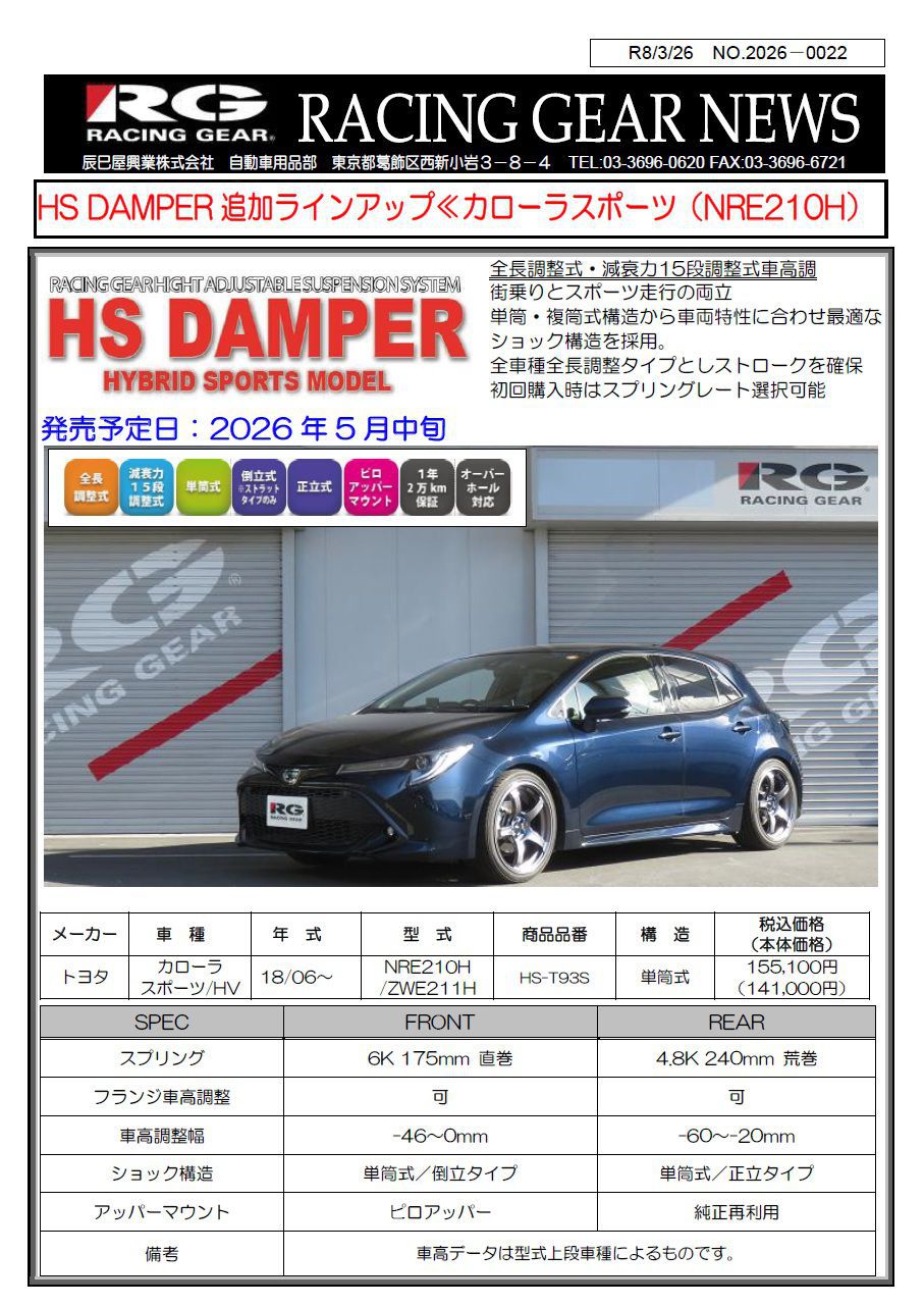 【新商品】HSダンパー 追加ラインアップ(トヨタ カローラスポーツ NRE210H/NWE211H)