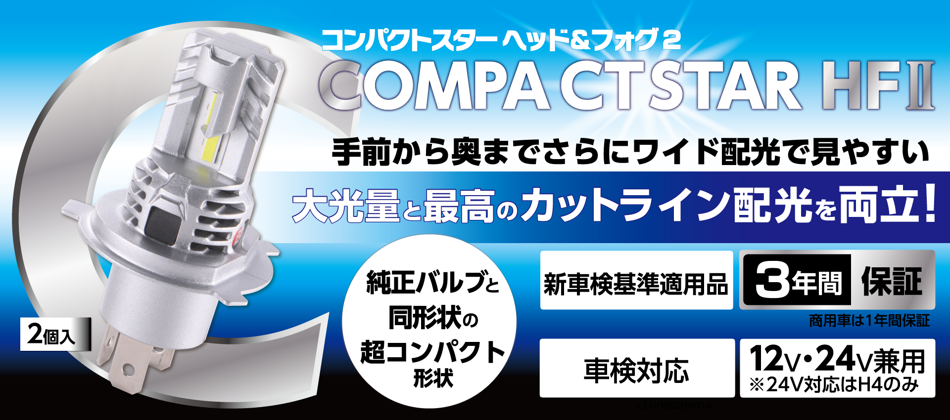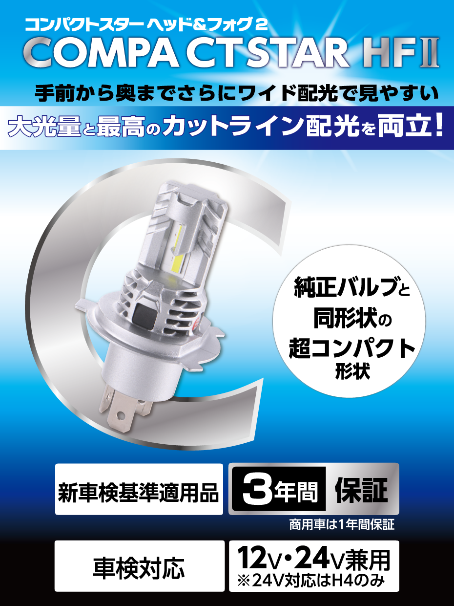 ※消費電力は片側1灯の片側1灯の表記です。※12V車専用モデルです。H4は12/24V兼用モデルです。商用車は保証1年にて対応。