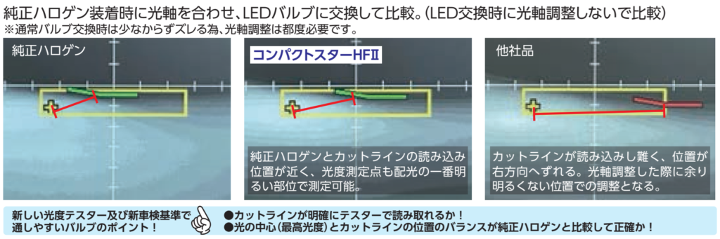 左上がりのカットオフライン角度・光軸測定点との距離を最適化。集光効率の最適化を行っているため、純正ハロゲン比約5倍以上アップする車両あり。