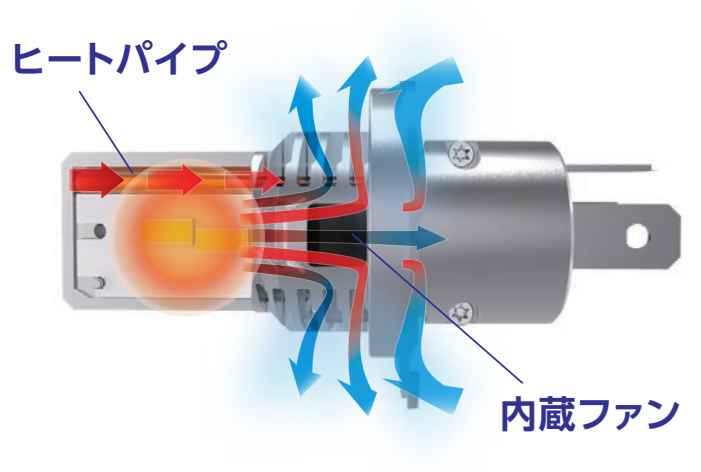 熱移動に優れた銅基板とヒートパイプを搭載。発光部の熱を内蔵ファン部まで効率的に移動させ熱ダレしない理想的な光束維持率を実現。