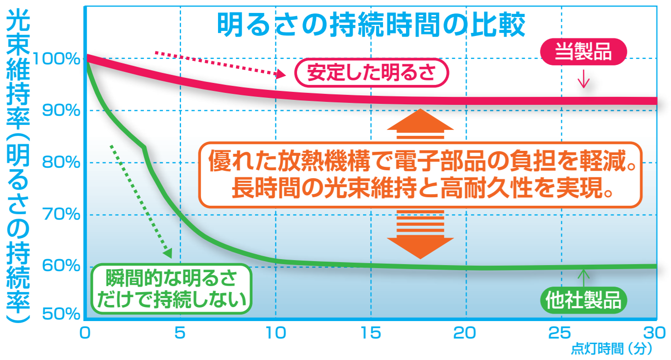 初期点灯(100%)の明るさを安定時も90%以上キープします。