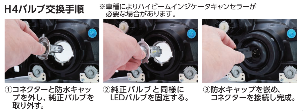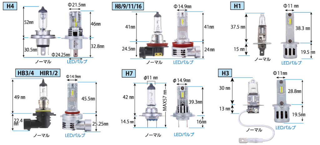 H4/H8・9・11・16/HB3・4/HIR1・2/H7/H1/H3を設定。H4は12V24V兼用仕様。その他は12V専用仕様。