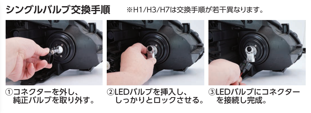 H4やその他シングルタイプはハロゲンバルブとほぼ同サイズなので、後方サイズなどを気にせずカプラーオンで装着できます。