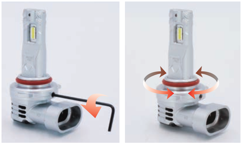 装着ロック時に斜めに装着されることが多いHB3/4タイプにバルブ回転機構を搭載。付属のL字レンチで調整。