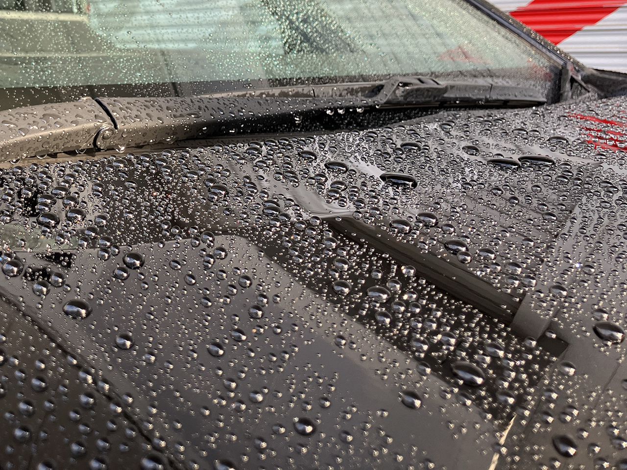 施工後のボディは、雨粒が玉状になって素早く流れ落ちる強力撥水。