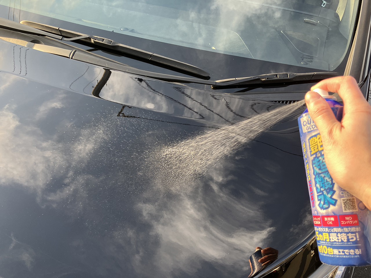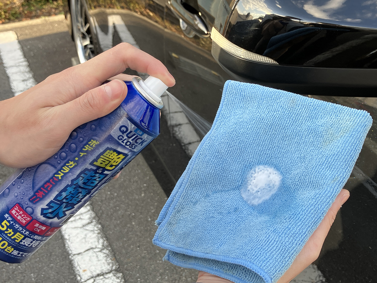 ボンネット、ドア、トランクなど、パネルごとに施工するとムラが少なく、綺麗に仕上がります。ミラー等の細かい過小への施工はクロスにスプレーし、塗り伸ばして行ってください。